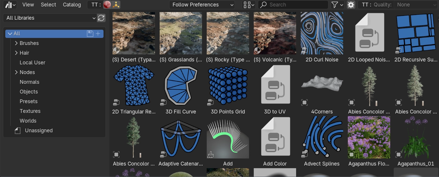 All TrueTERRAIN materials and scatter objects can be easily added into Blender's asset browser for easy access. We even have it setup for so that you can add new layers onto the TrueTERRAIN object for materials and scatter by dragging and dropping from the asset browser!